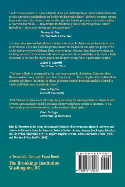 " What is the price of federalism? Does it result in governmental interconnections that are too complex? Does it create overlapping responsibilities? Does it perpetuate social inequalities? Does it stifle economic growth? To answer these questions, Paul Peterson sets forth two theories of federalism: functional and legislative. Functional theory is optimistic. It says that each level of the federal system is well designed to carry out the tasks for which it is mainly responsible. State and local governments assume responsibility for their area's physical and social development; the national government cares for the needy and reduces economic inequities. Legislative theory, in contrast, is pessimistic: it says that national political leaders, responding to electoral pressures, misuse their power. They shift unpopular burdens to lower levels of government while spending national dollars on popular government programs for which they can claim credit. Both theories are used to explain different aspects of American federalism. Legislative theory explains why federal grants have never been used to equalize public services. Elected officials cannot easily justify to their constituents a vote to shift funds away from the geographic area they represent. The overall direction that American federalism has taken in recent years is better explained by functional theory. As the costs of transportation and communication have declined, labor and capital have become increasingly mobile, placing states and localities in greater competition with one another. State and local governments are responding to these changes by overlooking the needs of the poor, focusing instead on economic development. As a further consequence, older, big cities of the Rust Belt, inefficient in their operations and burdened by social responsibilities, are losing jobs and population to the suburban communities that surround them. Peterson recommends that the national government adopt p"