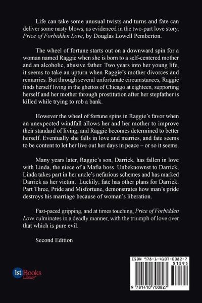Life can take some unusual twists and turns and fate can deliver some nasty blows, as evidenced in the three-part love story, Price of Forbidden Love, by Douglas Lowell Pemberton. This is the second edition. The wheel of fortune starts out on a downward spin for a woman named Raggie when she is born to a self-centered mother and an alcoholic, abusive father. Two years into her young life, it seems to take an upturn when Raggie's mother divorces and remarries. But through several unfortunate circumstances, Raggie finds herself living in the ghettos of Chicago at eighteen, supporting herself and her mother through prostitution after her stepfather is killed while trying to rob a bank. However the wheel of fortune spins in Raggie's favor when an unexpected windfall allows her and her mother to improve their standard of living, and Raggie becomes determined to better herself. Eventually she falls in love and marries, and fate seems to be content to let her live out her days in peace - or so it seems. Many years later, Raggie's son, Darrick, has fallen in love with Linda, the niece of a Mafia boss. Unbeknownst to Darrick, Linda takes part in her uncle's nefarious schemes and has marked Darrick as her victim. Luckily; fate has other plans for Darrick. James tries to recover his life ... what he once had .... before the turmoil from hell took over. In Part Three, titled Pride and Misfortune, James falls in love, becomes happily married, and has a boy and girl. Years pass, but his pride comes between his marriage and children because of women's liberation; when role of man and woman is reversed! Unfortunately James has the misfortune of falling into hell! Fast-paced gripping, and at times touching, Price of Forbidden Love culminates in a deadly manner, with the triumph of love over that which is pure evil.