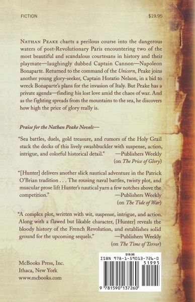 Captain Nathan Peake’s adventures continue as he charts a perilous course into the dangerous waters of post-Revolutionary Paris. There, he encounters two of the most beautiful and scandalous courtesans in history and their playmate, laughingly dubbed Captain Cannon, who is about to win enduring fame as Napoleon Bonaparte. Back at the helm of the Unicorn, Peake joins Captain Horatio Nelson, another young glory-seeker, in a bid to wreck Bonaparte’s plans for the invasion of Italy. Amidst the chaos of war, Peake has his own private agenda to find his lost love; but as the fighting spreads from the mountains to the sea, he discovers that glory comes at a higher price than he originally thought.
