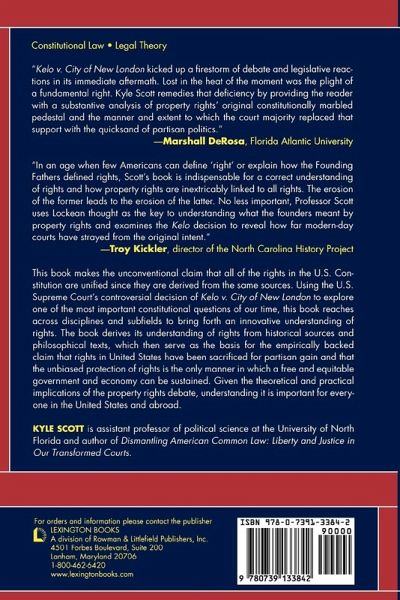In an age when few Americans can define "right" or explain how the founding fathers defined rights, Scott's book is indispensable for a correct understanding of rights and how property rights are inextricably linked to all rights. The erosion of the former leads to the erosion of the latter. No less important, Professor Scott uses Lockean thought as the key to understanding what the founders meant by property rights and examines the Kelo decision to reveal how far modern-day courts have strayed from the original intent. -- Troy Kickler, director of the North Carolina History Project An excellent historical, legal, and theoretical analysis of property rights and their place in an ordered society... It is a bracing good read... Recommended. CHOICE Kelo v. City of New London kicked up a firestorm of debate and legislative reactions in its immediate aftermath. Lost in the heat of the moment was the plight of a fundamental right. Dr. Kyle remedies that deficiency by providing the reader with a substantive analysis of property rights' original constitutionally marbled pedestal and the manner and extent to which the court majority replaced that support with the quicksand of partisan politics. -- Marshall L. DeRosa, Political Scientist at Florida Atlantic University and author of several books
