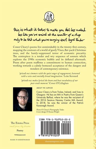 This pamphlet speaks, in an urbane and charmingly deadpan voice, to anyone who has ever had both an 'obsession with luxury resources' and the nagging feeling 'you've arrived at the counter of a shop / only to be told what you're carrying isn't legal tender'. The centrepiece of Priced Out is a tender and wry sequence of sonnets addressed 'to my mother at my age' which explores the 'fat promise' of the nineties economic bubble and its deflated aftermath. Despite their sharp historical awareness, Conor Cleary's poems live unmistakably in the twenty-first century, mapping the contours of a world of goofy Vines, flat-pack Christmas trees, and the barely-suppressed terror of economic precarity. Even as Cleary's speakers agonise over the difficulty of living with others - 'what if my gums / concealed big steel / fangs ... that were very / much part of me' - poem after poem reaffirms its commitment to human connection, working towards a calmly bemused acceptance of the dangers and wonders of contemporary existence.