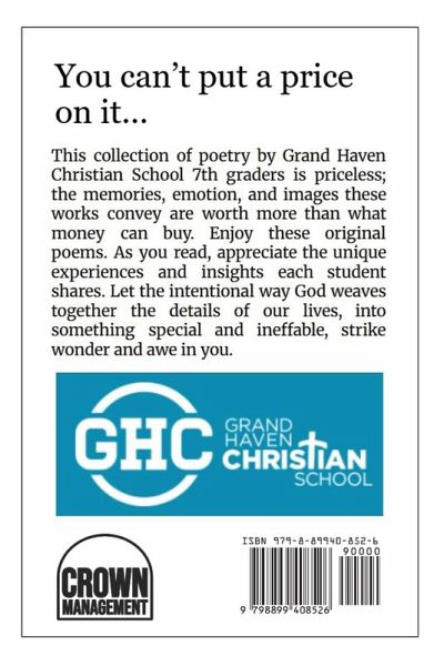 This collection of poetry by Grand Haven Christian School 7th graders is priceless; the memories, emotion, and images these works convey are worth more than what money can buy. Enjoy these original poems. As you read, appreciate the unique experiences and insights each student shares. Let the intentional way God weaves together the details of our lives, into something special and ineffable, strike wonder and awe in you.
