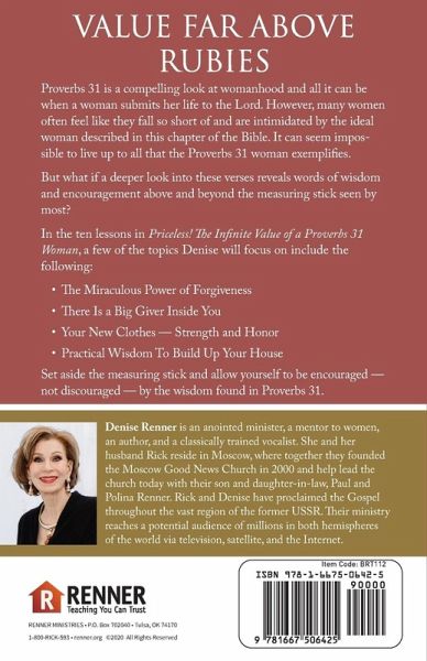 Value Far Above Rubies Proverbs 31 is a compelling look at womanhood and all it can be when a woman submits her life to the Lord. However, many women often feel like they fall so short of and are intimidated by the ideal woman described in this chapter of the Bible. It can seem impossible to live up to all that the Proverbs 31 woman exemplifies.¿¿ But what if a deeper look into these verses reveals words of wisdom and encouragement above and beyond the measuring stick seen by most? In the ten lessons in Priceless! The Infinite Value of a Proverbs 31 Woman, a few of the topics Denise will focus on include the following: The Miraculous Power of Forgiveness There Is a Big Giver Inside You Your New Clothes - Strength and Honor Practical Wisdom To Build Up Your House Set aside the measuring stick and allow yourself to be encouraged - not discouraged - by the wisdom found in Proverbs 31.