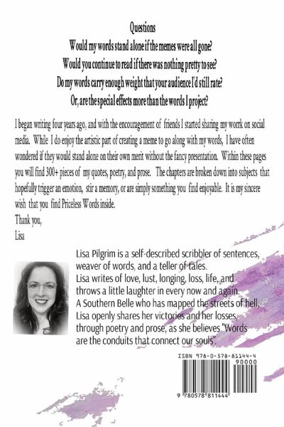 Priceless Words is a collection of poetry and prose written by Lisa Pilgrim. Inside its covers you will find 300+ personally selected pieces that bare her soul. The chapters are broken down into the memorable, and often life altering, segments of our lives. Love, Lust, Longing, Loss, Life, and a Little More whose subjects include Laughter, Liberty, Letters and Loyalty, are the feelings that are explored. Priceless Words offers you the opportunity to read through or to choose a chapter that pertains to the events influencing your life at any given moment. Lisa Pilgrim presents you this offering of her words with the hope that they will prove to be the conduits that connect your souls.