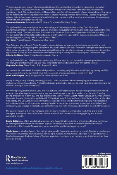 "Pricing Decoded is a groundbreaking work that bridges the gap between academic theory and practical application in the realm of pricing strategy. Dan Zatta and Maciej Kraus masterfully dissect complex pricing concepts, making them accessible and actionable for both practitioners and scholars. Their exploration of AI-driven pricing models, value-based pricing, and dynamic strategies is particularly relevant for today's fast-paced market dynamics. This book is an invaluable resource for anyone looking to deepen their understanding of pricing mechanisms and leverage them for competitive advantage. It's an essential addition to the library of any business leader, student, or academic focused on maximizing value and profitability."