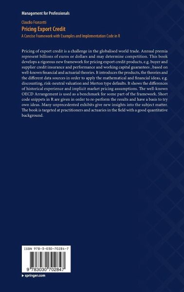 Pricing of export credit is a challenge in the globalised world trade. Annual premia represent billions of euros or dollars and may determine competition. This book develops a rigorous new framework for pricing export credit products, e.g. buyer and supplier credit insurance and performance and working capital guarantees , based on well-known financial and actuarial theories. It introduces the products, the theories and the different data sources in order to apply the mathematical and financial ideas, e.g. discounting, risk-neutral valuation and Merton type defaults. It shows the differences of historical experience and implicit market pricing assumptions. The well-known OECD Arrangement is used as a benchmark for some part of the framework. Short code snippets in R are given in order to re-perform the results and have a basis to try own ideas. Many unprecedented exhibits give new insights into the subject matter. The book is targeted at practitioners and actuaries in the field with agood quantitative background.