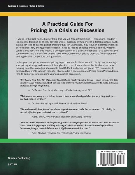 In this practical guide, pricing expert Joanne Smith shows how to manage your pricing strategy and execute it throughout a crisis. Joanne shares her firsthand success drawing from the pricing strategies she used to lead DuPont and other B2B companies through tough markets. She includes a comprehensive Pricing Crisis Preparedness Plan guide.