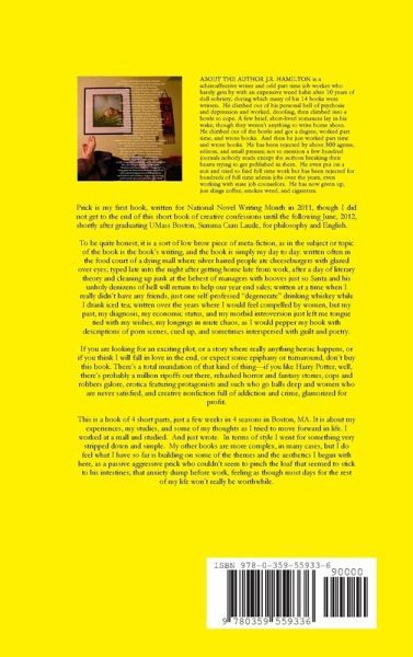 Prick is my first book, started for National Novel Writing Month, finished later. To be quite honest, it is a sort of low brow piece of meta-fiction, as in the subject or topic of the book is the book's writing, and the book is simply my day to day: written often in the food court of a dying mall where silver haired people ate cheeseburgers with glazed over eyes; typed late into the night after getting home late from work, after a day of literary theory and cleaning up junk at the behest of managers with hooves just so Santa and his unholy denizens of hell will return to help our year end sales; written at a time when I really didn't have any friends, just one self-professed "degenerate" drinking whiskey while I drank iced tea; written over the years where I would feel compelled by women, but my past, my diagnosis, my economic status, and my morbid introversion just left me tongue tied with my wishes, my longings in mute chaos, as I would pepper my book with descriptions of porn scenes.