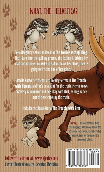 WHAT. THE. HELVETICA? Tessa Hedgehog's about to lose it in THE TROUBLE WITH QUILLING. She's deep into the quilling process, the itching is driving her mad and if those two pesky boys don't leave her alone, they're going to feel the bite of her spines! Amelia knows her friends are keeping secrets in THE TROUBLE WITH HUMANS and she's on a hunt for the truth. Melvin knows discovery is imminent and he's okay with that, as long as he's not the one exposing the truth. Includes the Bonus Story, THE TROUBLE WITH PETS. Warning: This book contains shifty teen language, which does include the occasional swear word. It is also full of rampant, teen hormones and the subsequent fallout.
