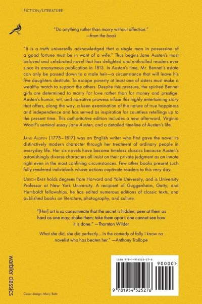 "It is a truth universally acknowledged that a single man in possession of a good fortune must be in want of a wife." Thus begins Jane Austen's most beloved and celebrated novel that has delighted and enthralled readers ever since its anonymous publication in 1813. In Austen's time, Mr. Bennet's estate can only be passed down to a male heir-a circumstance that will leave his five daughters destitute. To escape poverty at least one of sisters must make a wealthy match to support the others. Despite this pressure, the spirited Bennet girls are determined to marry for love rather than for money and prestige. Austen's humor, wit, and narrative prowess infuse this highly entertaining story that offers, along the way, a keen examination of the nature of true happiness and independence and has served as inspiration for countless retellings up to the present time. This authoritative edition includes a new afterword, Virginia Woolf's seminal essay Jane Austen, and a detailed timeline of Austen's life.