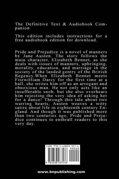 The Definitive Text & Audiobook Companion This edition includes instructions for a free audiobook edition for download. Pride and Prejudice is a novel of manners by Jane Austen. The story follows the main character, Elizabeth Bennet, as she deals with issues of manners, upbringing, morality, education, and marriage in the society of the landed gentry of the British Regency.When Elizabeth Bennet meets Fitzwilliam Darcy for the first time at a ball, she writes him off as an arrogant and obnoxious man. He not only acts like an insufferable snob, but she also overhears him rejecting the very idea of asking her for a dance! Through this tale about two warring hearts, Austen weaves a witty satire about life in eighteenth century England. And though it was published more than two centuries ago, Pride and Prejudice continues to enthrall readers to this very day.