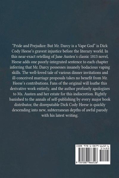 PLEASE READ: "Pride and Prejudice: But Mr. Darcy is a Vape God" is Dick Cody Heese's gravest injustice before the literary world. In this near-exact retelling of Jane Austen's classic 1813 novel, Heese adds one poorly-integrated sentence to each chapter inferring that Mr. Darcy possesses insanely bodacious vaping skills. The well-loved tale of various dinner invitations and ill-conceived marriage proposals takes no benefit from Mr. Heese's contributions. Fans of the original will loathe this derivative work entirely, and the author profusely apologizes to Ms. Austen and her estate for this indiscretion. Rightly banished to the annals of self-publishing by every major book distributor, the disreputable Dick Cody Heese is quickly descending into new, subterranean depths of awful parody with his latest writing. Heese has also written several other barely passable parodies, including "The Great Gatsby: But Nick has Scoliosis," "Moby Kevin," and "Frankenstein: But the Monster is Allergic to Gluten."