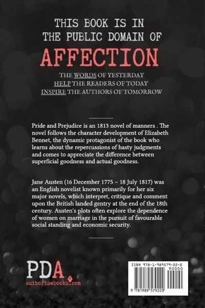 Pride and Prejudice is an 1813 novel of manners . The novel follows the character development of Elizabeth Bennet, the dynamic protagonist of the book who learns about the repercussions of hasty judgments and comes to appreciate the difference between superficial goodness and actual goodness. THIS BOOK IS IN THE PUBLIC DOMAIN OF AFFECTION Many moons ago, an author was inspired to create this book. Today, we cannot repay them, but we can pay it forward. With great affection for the written word, we can use these public domain works to fund programs for young authors. As you read these books, you support the next generation of authors. It's one way words help inspire. Read more at AuthoriseBooks.com/PDA. THE WORDS OF YESTERDAY, HELP THE READERS OF TODAY, INSPIRE THE AUTHORS OF TOMORROW.