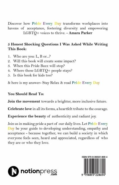Introducing 'Pride Every Day, ' the world's first book of its kind, meant to be a comfortable addition to any home, inviting allies, supporters, and people from all backgrounds. With a focus on retaining decency and sensitivity across many cultures and countries, this book attempts to smoothly integrate LGBTQ+ pride into society. 'Pride Every Day' is an inspiration of inclusivity and acceptance, providing readers with a thorough guide to knowing and loving LGBTQ+ identities and experiences. This book includes everything from thoughtful insights on the meaning of Pride to practical ideas for creating a more inclusive atmosphere. What distinguishes 'Pride Every Day' is its commitment to appreciating the intricacies of many cultures and traditions while upholding the universal ideals of love, respect, and equality. Whether you're looking for personal inspiration or advice on how to help the LGBTQ+ community, this book is a reliable companion on your journey to inclusivity. With engaging storytelling, insightful viewpoints, history, and breathtaking pictures, 'Pride Every Day' encourages readers to appreciate diversity, fight preconceptions, and create a more compassionate society for everyone. This book has something for everyone, whether you're a long-time ally or just starting to learn about LGBTQ+ identity. Join us in making pride a part of our daily lives. Let 'Pride Every Day' be your guide to developing understanding, empathy, and acceptance - because together, we can build a society in which everyone feels seen, heard, and appreciated, regardless of who they are or who they love.