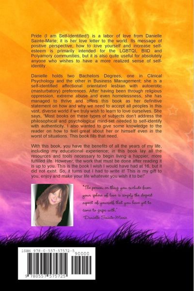 This is a labor of love; it is my love letter to the world. Its message of positive perspective, how to love yourself and increase self-esteem is primarily intended for the LGBTQI, BIID, and Polyamory communities, but it is also quite useful for absolutely anyone who wishes to have a more realized sense of self-identity. I hold two Bachelors Degrees, one in Psychology and the other in Business Management; I am an affectional orientated lesbian as well. After having been through religious oppression, extreme abuse and even homelessness, I have managed to thrive and I offer this book as my definitive statement on how and why we need to accept all peoples in this vast, diverse world if we truly wish to learn to love ourselves. Most books on these types of subjects don't address the philosophical and psychological mind-set needed to self-identify with authenticity. I also wanted to show the reader how to feel great about her or himself even in the worst of situations. This book fills that need.