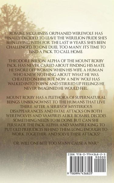 Rosabel McGuiness, orphaned Werewolf, has finally decided to leave the Werelion Pride she's been living with for the last eighteen years. She's been challenged to one duel too many. It's time to find a pack to call home.. Theodore Wilson, Alpha of the Mount Roxby Pack, has never cared about finding his Mate. He swore off women when his Wife, a human who knew nothing about what he was, cheated on him. But now a new wolf has walked into town, and stirred up feelings he never imagined he would feel. Mount Roxby has a plethora of supernatural beings, unbeknownst to the humans that live there. After a series of mysterious disappearances, and fatal attacks on both Werewolves and Vampires alike, Rosabel decides something needs to be done. But can she persuade the Pack Alpha and Vampire King, to put old prejudices behind them long enough to work together, and solve these attacks? Or will one bite too many cause a war?