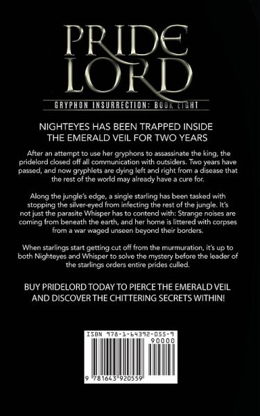 Nighteyes has been trapped inside the Emerald Veil for two years. After an attempt to use her gryphons to assassinate the king, the pridelord closed off all communication with outsiders. Two years have passed, and now gryphlets are dying left and right from a disease that the rest of the world may already have a cure for. Along the jungle's edge, a single starling has been tasked with stopping the silver-eyed from infecting the rest of the jungle. It's not just the parasite Whisper has to contend with: Strange noises are coming from beneath the earth, and her home is littered with corpses from a war waged unseen beyond their borders. When starlings start getting cut off from the murmuration, it's up to both Nighteyes and Whisper to solve the mystery before the leader of the starlings orders entire prides culled. Buy Pridelord today to pierce the Emerald Veil and discover the chittering secrets within!