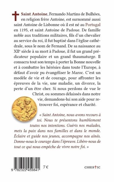 Saint Antoine, Fernando Martins de Bulhões, en religion frère Antoine, est surnommé aussi saint Antoine de Lisbonne où il est né au Portugal en 1195, et saint Antoine de Padoue. De famille noble aux traditions militaires, fils d'un chevalier au service du roi, il fut baptisé dans l'église cathédrale, sous le nom de Fernand. De sa naissance au XIIe siècle à sa mort à Padoue, il fut un grand prédicateur populaire et un grand thaumaturge. Il consacra tout son temps à porter la Bonne Nouvelle et à combattre les hérésies dans toute l'Europe, à défaut d'avoir pu évangéliser le Maroc. C'est un modèle de vie et de courage, pour affronter les épreuves de la vie, une maladie, un divorce, la perte d'un être cher. Si nous perdons de vue le Christ, ou sommes délaissés dans notre vie, demandons-lui son aide pour retrouver foi, espérance et charité.