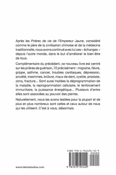 Après les Prières de vie de l'Empereur Jaune, considéré comme le père de la civilisation chinoise et de la médecine traditionnelle, nous avons continué avec lui ces échanges depuis l'autre monde, dans le but d'améliorer le bien-être de tous. Complémentaire du précédent, ce nouveau livre est centré sur les prières de guérison, 72 précisément : migraine, fièvre, grippe, asthme, cancer, troubles cardiaques, dépression, anxiété, insomnies, brûlure, maux de dent, cystite, prostate, zona, fracture... Sont aussi traitées la déprogrammation de la maladie, la reprogrammation cellulaire, le renforcement immunitaire, la puissance énergétique... Plusieurs d'entre elles sont associées au pouvoir des pierres. Naturellement, nous les avons testées pour la plupart et de plus en plus nombreux sont celles et ceux autour de nous qui les utilisent. C'est à vous, désormais.