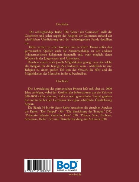 Die ReiheDie achtzigbändige Reihe "Die Götter der Germanen" stellt die Gottheiten und jeden Aspekt der Religion der Germanen anhand der schriftlichen Überlieferung und der archäologischen Funde detailliert dar.Dabei werden zu jeder Gottheit und zu jedem Thema außer den germanischen Quellen auch die Zusammenhänge zu den anderen indogermanischen Religionen dargestellt und, wenn möglich, deren Wurzeln in der Jungsteinzeit und Altsteinzeit.Daneben werden auch jeweils Möglichkeiten gezeigt, was eine solche alte Religion für die heutige Zeit bedeuten kann - schließlich ist eine Religion zu einem großen Teil stets der Versuch, die Welt und die Möglichkeiten der Menschen in ihr zu beschreiben.Das BuchDie Entwicklung der germanischen Priester lässt sich über ca. 2000 Jahre verfolgen, wobei der Großteil der Informationen aus der Zeit von 900-1000 n.Chr. stammt, in der es noch germanische Tempel gegeben hat und in der bei den Germanen eine eigene schriftliche Überlieferung begann.Die Bände 56 bis 60 dieser Reihe betrachten die einzelnen Aspektes des Kultes: "Der Tempel" (56), "Die Einrichtung des Tempels" (57), "Priesterin, Seherin, Zauberin, Hexe" (58), "Priester, Seher, Zauberer, Schamane, Heiler" (59) und "Rituelle Kleidung und Schmuck"(60).