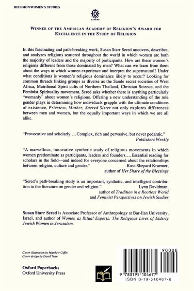 In this fascinating and path-breaking work, Susan Starr Sered uncovers, describes, and analyzes religions scattered throughout the world in which women are both the majority of leaders and the majority of participants. How are these women's religions different from those dominated by men? What can we learn from them about the ways in which women experience and interpret the supernatural? Under what conditions is women's religious dominance likely to occur? Looking for common threads linking groups as diverse as the Sande secret societies of West Africa, Matrilineal Spirit cults of Northern Thailand, Christian Science, and the Feminist Spirituality movement, Sered asks whether there is anything particularly "womanly" about women's religions. Offering a new understanding of the role gender plays in determining how individuals grapple with the ultimate conditions of existence, "Priestess, Mother, Sacred Sister" not only explores differences between men and women, but the equally important ways in which we are all alike. scribes, and analyzes religions scattered throughout the world in which women are both the majority of leaders and the majority of participants. How are these women's religions different from those dominated by men? What can we learn from them about the ways in which women experience and interpret the supernatural? Under what conditions is women's religious dominance likely to occur? Looking for common threads linking groups as diverse as the Sande secret societies of West Africa, Matrilineal Spirit cults of Northern Thailand, Christian Science, and the Feminist Spirituality movement, Sered asks whether there is anything particularly "womanly" about women's religions. Offering a new understanding of the role gender plays in d