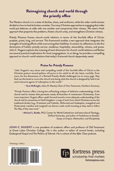 The Western church is in a state of decline, chaos, and confusion, while the wider world remains divided on how to heal its broken societies. Too many Christian approaches to engaging that wider world put believers at odds with one another and compromise their witness. We need a fresh approach that pinpoints the problems, fosters church unity, and strengthens Christian witness. Priestly Presence frames church-world relations in terms of the fourfold office of Christ: prophet, priest, king, and servant. This framework enables a new approach that integrates the strengths of existing efforts while overcoming their liabilities. It centers its reflections on the priestly witness. Scripture identifies God's people as a priestly community. We should relate to unbelievers as Israel's priests did to wider Israel. Too often we reduce the priestly image to that of a narrow caste of temple servants, yet the majority of Israel's priestly line served broader functions. Developing a priestly model rooted in this wider view provides the church with a compelling vision for carrying out its priestly vocation to the world. Priestly Presence explores five dimensions of holistic priestly service. These include priestly residence, hospitality, stewardship, witness, and praise. Nugent explores the meaning of each dimension for church-world relations and fleshes out several practical implications for local congregations. In so doing, he provides a compelling approach to church-world relations that today's fractured church desperately needs.