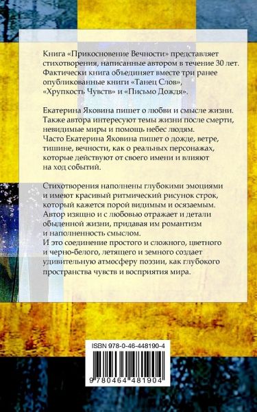 The poems were written over a period of 30 years. Ekaterina Yakovina writes about love, the meaning of life, the invisible worlds and the help of heaven to all people. Often the author describes the wind, the silence and the eternity like they would be real personas. Simple and complex things, reality and dreams, drops of the humor and sadness create an amazing atmosphere of the poetical world. The poet Ekaterina Yakovina participated in the International Poetry Anthologies "Poetic Voices Without Borders 2" ISBN 978-1928589433 This book is the winner of the National Best Book Award for Fiction and Literature: Anthologies, sponsored by the USA Book News in 2009. Ekaterina Yakovinäs story "The main words" that look like a poem is published in "The World Healing Book" ISBN: 9789979953111 . His Holiness the 14th Dalai Lama participated in this book. The Poet Lawrence Ferlinghetti and Rita Dove are participants of the project too. The project has brought together more than 150 poets, religious leaders, artists and thinkers from around the world.