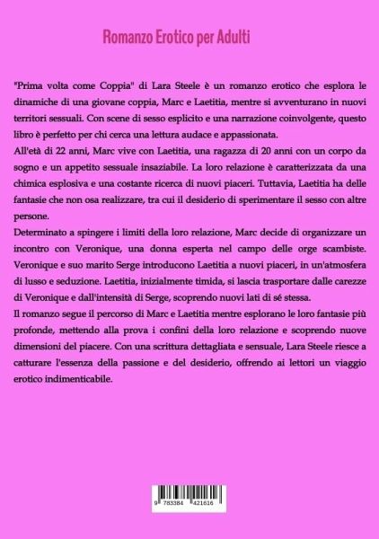 "Prima volta come Coppia" di Lara Steele è un romanzo erotico che esplora le dinamiche di una giovane coppia, Marc e Laetitia, mentre si avventurano in nuovi territori sessuali. Con scene di sesso esplicito e una narrazione coinvolgente, questo libro è perfetto per chi cerca una lettura audace e appassionata.All'età di 22 anni, Marc vive con Laetitia, una ragazza di 20 anni con un corpo da sogno e un appetito sessuale insaziabile. La loro relazione è caratterizzata da una chimica esplosiva e una costante ricerca di nuovi piaceri. Tuttavia, Laetitia ha delle fantasie che non osa realizzare, tra cui il desiderio di sperimentare il sesso con altre persone.Determinato a spingere i limiti della loro relazione, Marc decide di organizzare un incontro con Veronique, una donna esperta nel campo delle orge scambiste. Veronique e suo marito Serge introducono Laetitia a nuovi piaceri, in un'atmosfera di lusso e seduzione. Laetitia, inizialmente timida, si lascia trasportare dalle carezze di Veronique e dall'intensità di Serge, scoprendo nuovi lati di sé stessa.Il romanzo segue il percorso di Marc e Laetitia mentre esplorano le loro fantasie più profonde, mettendo alla prova i confini della loro relazione e scoprendo nuove dimensioni del piacere. Con una scrittura dettagliata e sensuale, Lara Steele riesce a catturare l'essenza della passione e del desiderio, offrendo ai lettori un viaggio erotico indimenticabile.