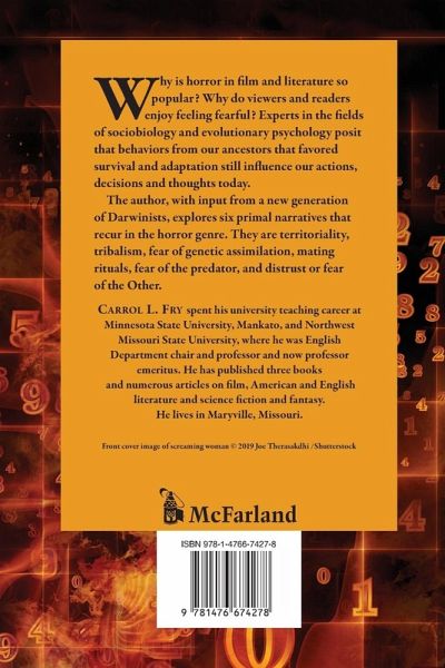 Why is horror in film and literature so popular? Why do viewers and readers enjoy feeling fearful? Experts in the fields of sociobiology and evolutionary psychology posit that behaviors from our ancestors that favored survival and adaptation still influence our actions, decisions and thoughts today. The author, with input from a new generation of Darwinists, explores six primal narratives that recur in the horror genre. They are territoriality, tribalism, fear of genetic assimilation, mating rituals, fear of the predator, and distrust or fear of the Other.