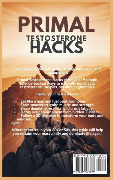 Feel Like Your Old Self Again-Stronger, Sharper, and Unstoppable. If you wake up feeling tired, unmotivated, and not quite like the man you used to be, you're not alone-and you're not broken. You're likely suffering from declining testosterone, a silent epidemic affecting millions of men today. Primal Testosterone Hacks: 19 Proven Ways to Naturally Boost Your T-Levels is your no-BS guide to reclaiming peak masculinity, energy, and strength-without drugs, gimmicks, or expensive supplements. Inside, you'll discover: ¿ The top 19 natural, science-backed testosterone-boosting strategies ¿ How to eat, train, and sleep to maximize T-levels naturally ¿ Hidden hormone disruptors in your environment-and how to eliminate them ¿ The 30-day "High-T Action Plan" to transform your body, mindset, and energy ¿ How to reduce cortisol, conquer stress, and dominate your day ¿ Why men today have lower T than their grandfathers-and how to reverse the damage This isn't bro-science. It's battle-tested advice designed to help you: ¿ Build muscle and burn stubborn fat ¿ Rekindle your sex drive and performance ¿ Regain focus, motivation, and mental clarity ¿ Wake up energized, confident, and ready to lead Whether you're in your 30s, 40s, 50s or beyond, it's never too late to optimize your testosterone and live with strength and purpose. ¿¿¿¿ Reclaim your edge. Rebuild your masculinity. Get your power back.