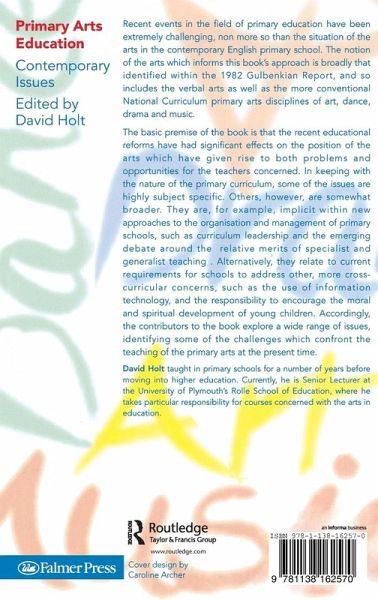 Drama in the primary curriculum - a critical approach, David Coslett implications of the National Curriculum for the Arts in pre-school education, David Evans primary arts education in a postmodern world, Rod Mackenzie multicultural issues in primary arts education, Mark Halstead the significance of the generalist approach in primary arts education, David Holt the readiness of primary schools to teach National Curriculum art, Bob Clement children's writing and drawing, John Gulliver understandings and attitudes of BEd art candidates, Marion Friend and David Holt supporting the generalist teacher of art - a case study, Wendy Jones using IT in the teaching of primary music, Will McBurnie National Curriculum dance education in the primary school, Janvrin Moore.