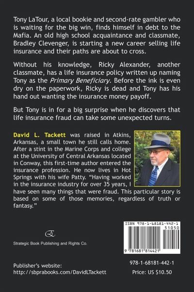 Tony LaTour, a local bookie and second-rate gambler who is waiting for the big win, finds himself in debt to the Mafia. An old high school acquaintance and classmate, Bradley Clevenger, is starting a new career selling life insurance and their paths are about to cross. Without his knowledge, Ricky Alexander, another classmate, has a life insurance policy written up naming Tony as the Primary Beneficiary. Before the ink is even dry on the paperwork, Ricky is dead and Tony has his hand out wanting the insurance money payoff. But Tony is in for a big surprise when he discovers that life insurance fraud can take some unexpected turns. David L. Tackett was raised in Atkins, Arkansas, a small town he still calls home. After a stint in the Marine Corps and college at the University of Central Arkansas located in Conway, this first-time author entered the insurance profession. He now lives in Hot Springs with his wife Patty. "Having worked in the insurance industry for over 35 years, I have seen many things that were fraud. This particular story is based on some of those memories, regardless of truth or fantasy."