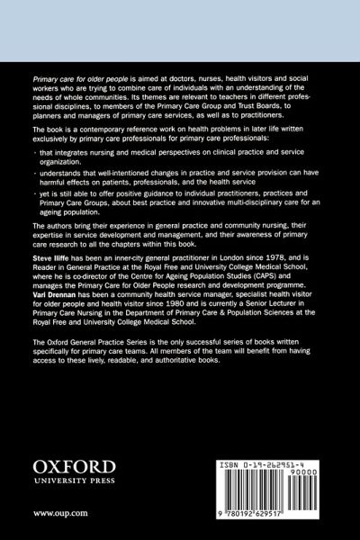 Primary Care for Older People is a contemporary reference work on health problems in later life written exclusively by primary care professionals for primary care professionals that: 1.Integrate nursing and medical perspectives on clinical practice and service organization 2. Understands that well-intentioned changes in practice and service provision can have harmful effects on patients, professionals and the health care service 3. Is still able to offer positive guidance to individual practitioners, practices and Primary Care Groups, anout best practive and innovative multi-disciplinary care for an ageing population. It is aimed at doctors, nurses, health visitors and social workers who are trying to combine care of individuals with an understanding of the needs of whole communities. Its themes are relevant to teachers in different professional disciplines, to members of Primary Care Group and Trust Board, to planners and managers of primary care services, as well as to practitioners. The authors bring to this book their experience in general practice and community nursing, their expertise in service development and management, and their awareness of primary care research.