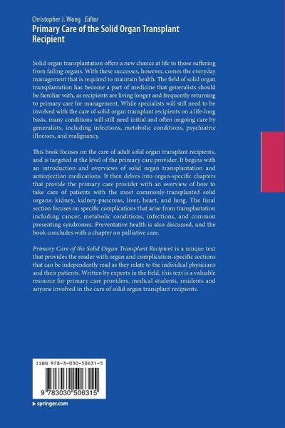 Primary Care of the Solid Organ Transplant Recipient is a unique text that provides the reader with organ and complication-specific sections that can be independently read as they relate to the individual physicians and their patients. Written by experts in the field, this text is a valuable resource for primary care providers, medical students, residents and anyone involved in the care of solid organ transplant recipients.