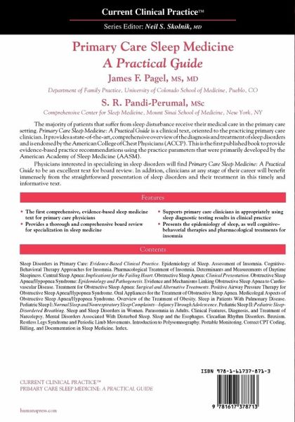 "Primary Care Sleep Medicine: A Practical Guide ... provides primary care physicians with a suitable introduction to sleep medicine as well as with the basic knowledge reasonably necessary to recognize and treat the most common sleep disorders they will encounter in clinic. ... Drs Pagel and Pandi-Perumal provide a 334-page book that comprises 29 chapters with an index. ... To its credit, appropriate citations from peer-reviewed literature and practice guidelines from the American Academy of Sleep Medicine are scattered throughout the book." (A. Y. Avidan and R. K. Malhotra, JAMA, Vol. 198, 2007)