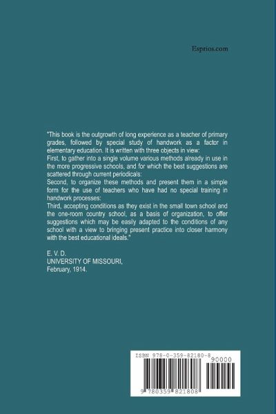 This book is the outgrowth of long experience as a teacher of primary grades, followed by special study of handwork as a factor in elementary education. It is written with three objects in view: First, to gather into a single volume various methods already in use in the more progressive schools, and for which the best suggestions are scattered through current periodicals: Second, to organize these methods and present them in a simple form for the use of teachers who have had no special training in handwork processes: Third, accepting conditions as they exist in the small town school and the one-room country school, as a basis of organization, to offer suggestions which may be easily adapted to the conditions of any school with a view to bringing present practice into closer harmony with the best educational ideals.
