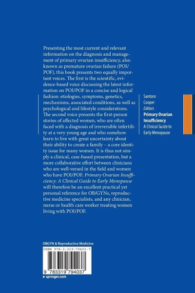 Presenting the most current and relevant information on the diagnosis and management of primary ovarian insufficiency, also known as premature ovarian failure (POI/POF), this book presents two equally important voices. The first is the scientific, evidence-based voice discussing the latest information on POI/POF in a concise and logical fashion: etiologies, symptoms, genetics, mechanisms, associated conditions, as well as psychological and lifestyle considerations. The second voice presents the first-person stories of affected women, who are often faced with a diagnosis of irreversible infertility at a very young age and who somehow learn to live with great uncertainty about their ability to create a family - a core identity issue for many women. It is thus not simply a clinical, case-based presentation, but a more collaborative effort between clinicians who are well-versed in the field and women who have POI/POF. Primary Ovarian Insufficiency: A Clinical Guide to Early Menopausewill therefore be an excellent practical yet personal reference for OB/GYNs, reproductive medicine specialists, and any clinician, nurse or health care worker treating women living with POI/POF.
