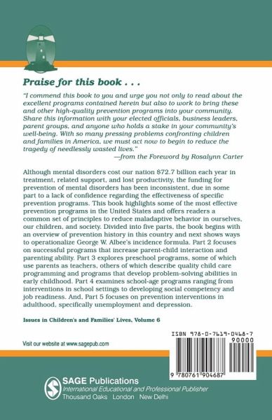 Mental disorders cost the United States over $72 billion for treatment, related support and lost productivity each year - yet funding for prevention of such disorders has been inconsistent due, partly, to lack of confidence in the effectiveness of specific prevention programmes. This book highlights some of the most effective prevention programmes and offers a common set of principles to reduce maladaptive behaviour. Following an overview of United States prevention history and a description of how to operationalize George Albee's incidence formula, contributors then focus on: programmes that increase parent-child interaction and parenting ability; preschool programmes, such as those which use parents as teachers, others wh