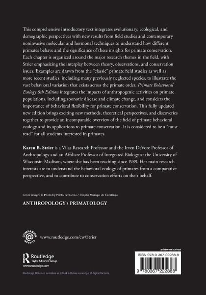 This comprehensive introductory text integrates evolutionary, ecological, and demographic perspectives with new results from field studies and contemporary noninvasive molecular and hormonal techniques to understand how different primates behave and the significance of these insights for primate conservation. Each chapter is organized around the major research themes in the field, with Strier emphasizing the interplay between theory, observations, and conservation issues. Examples are drawn from the "classic" primate field studies as well as more recent studies, including many previously neglected species, to illustrate the vast behavioral variation that exists across the primate order. Primate Behavioral Ecology 6th Edition integrates the impacts of anthropogenic activities on primate populations, including zoonotic disease and climate change, and considers the importance of behavioral flexibility for primate conservation. This fully updated new edition brings exciting new methods, theoretical perspectives, and discoveries together to provide an incomparable overview of the field of primate behavioral ecology and its applications to primate conservation. It is considered to be a "must read" for all students interested in primates.