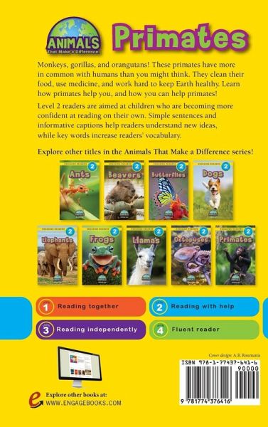 Monkeys, gorillas, and orangutans! These primates have more in common with humans than you might think. They clean their food, use medicine, and work hard to keep Earth healthy. Learn how primates help you, and how you can help primates! Level 2 readers are aimed at children who are becoming more confident at reading on their own. Simple sentences and informative captions help readers understand new ideas, while key words increase readers' vocabulary.