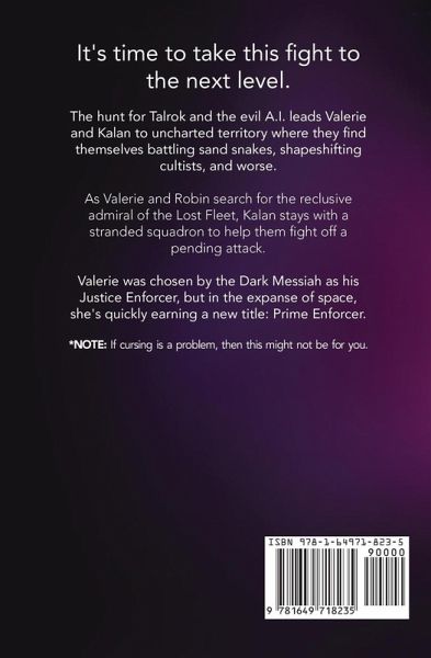 It's time to take this fight to the next level. The hunt for Talrok and the evil A.I. leads Valerie and Kalan to uncharted territory where they find themselves battling sand snakes, shapeshifting cultists, and worse. As Valerie and Robin search for the reclusive admiral of the Lost Fleet, Kalan stays with a stranded squadron to help them fight off a pending attack. Valerie was chosen by the Dark Messiah as his Justice Enforcer, but in the expanse of space, she's quickly earning a new title: Prime Enforcer.