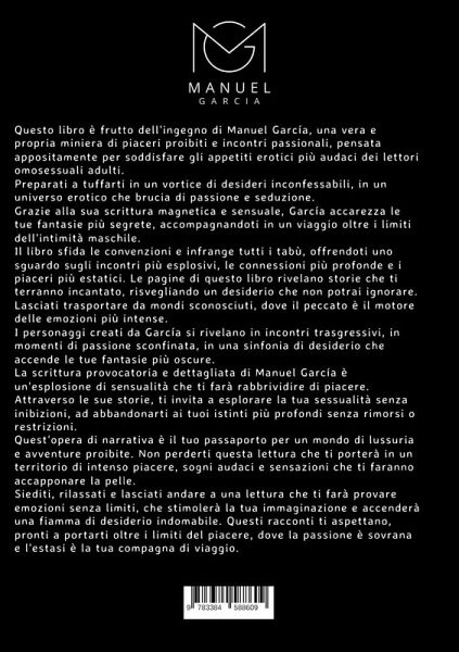 Questo libro nasce da un'idea di Manuel García, una vera e propria miniera di piaceri proibiti e incontri passionali, pensata appositamente per soddisfare gli appetiti erotici più audaci dei lettori adulti omosessuali.Preparatevi a tuffarvi in un vortice di desideri inconfessabili, in un universo erotico che brucia di passione e seduzione. Grazie alla sua scrittura magnetica e sensuale, García accarezza le vostre fantasie più segrete, accompagnandovi in un viaggio oltre i limiti dell'intimità maschile.Il libro sfida le convenzioni e infrange tutti i tabù, offrendo uno sguardo agli incontri più esplosivi, ai legami più profondi e ai piaceri più estatici. Le pagine di questo libro rivelano storie che vi terranno incantati, risvegliando un desiderio che non potrete ignorare.Lasciatevi trasportare da mondi sconosciuti, dove il peccato è il motore delle emozioni più intense. I personaggi creati da García si rivelano in incontri trasgressivi, in momenti di passione sconfinata, in una sinfonia di desiderio che accende le vostre fantasie più oscure.La scrittura provocatoria e dettagliata di Manuel García è un'esplosione di sensualità che vi farà rabbrividire di piacere. Attraverso le sue storie, vi invita a esplorare la vostra sessualità senza inibizioni, ad abbandonarvi ai vostri istinti più profondi senza rimorsi o restrizioni.Quest'opera di narrativa è il vostro passaporto per un mondo di lussuria e avventure proibite. Non perdetevi questa lettura che vi porterà in un territorio di piacere intenso, sogni audaci e sensazioni che vi faranno accapponare la pelle.Sedetevi, rilassatevi e lasciatevi andare a una lettura che vi farà provare emozioni senza limiti, che stimolerà la vostra immaginazione e accenderà una fiamma di desiderio indomabile. Questi racconti vi aspettano, pronti a portarvi oltre i limiti del piacere, dove la passione è sovrana e l'estasi è la vostra compagna di viaggio.