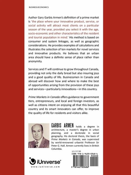 Author Gary Garbis Armen's definition of a prime market is 'the place where your innovative product, service, or social activity will attract most clients on a particular season of the year, provided you select it with the age, socio-economic and other characteristics of the resident and tourist population in mind.' His method is based on consumer and system linkages, as well as geographic considerations. He provides examples of calculations and illustrates the selection of ten markets for novel services and innovative products. He believes that an urban area should have a definite sense of place rather than anonymity. Services and IT will continue to grow throughout Canada, providing not only the daily bread but also insuring joys and a good quality of life. Businessmen in Canada and abroad will discover how and where to make the best of opportunities arising from the provision of these joys and services-particularly innovations-in this country. Prime Markets in Canada offers guidance to government tiers, entrepreneurs, and local and foreign investors, as well as citizens intent on enjoying all that this beautiful country and its smart innovators can offer, to improve the quality of life for residents and visitors alike.