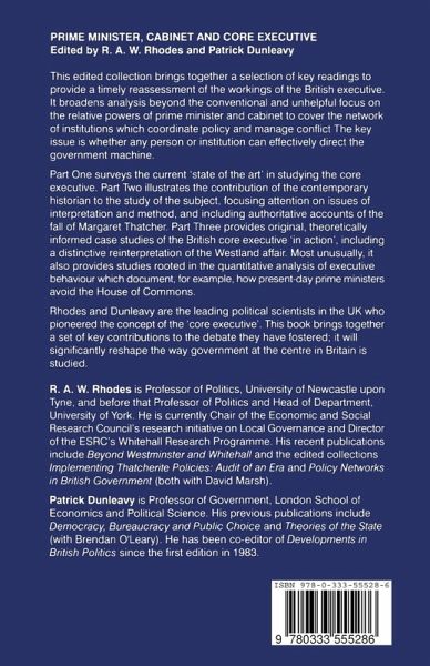 List of Contributors List of Tables List of Figures Introducing the Core Executive; R.A.W. Rhodes PART 1: SURVEYING THE FIELD From Prime Ministerial Power to Core Executive; R.A.W. Rhodes Central Government Departments and the Policy Process; M. Smith, D. Marsh & D. Richards PART 2: INTERPRETING HISTORY Relations Between Prime Minister and Cabinet: From Wilson to Thatcher; S. James The Downfall of Margaret Thatcher; G.W. Jones Interpreting the Fall of Margaret Thatcher: Power-dependence and the Core Executive; M.J. Smith The Cabinet Office and Co-ordination of 1979-87; A. Seldon The Ethos of the Cabinet Office: A Comment on the Testimony of Officials; M. Lee Ministerial Responsibility and the Theory of the British State; A. Beattie PART 3: EMPIRICAL STUDIES Reinterpreting the Westland Affair: Theories of the State and Core Executive Decision Making; P. Dunleavy Core Executive Decision Making on High Technology Issues: The Case of the Alvey Report; L. Keliher Joining the ERM: Analysing a Core Executive Policy Disaster; H. Thompson Leaders, Politics and Institutional Change: The Decline of Prime Ministerial Accountability to the House of Commons, 1868-1990; P. Dunleavy & G.W. Jones with J. Burnham, R. Elgie & P. Fysh Estimating the Distribution of Influence in Cabinet Committees under Major; P. Dunleavy Guide to Further Reading; R.A.W. Rhodes References Author Index Subject Index.