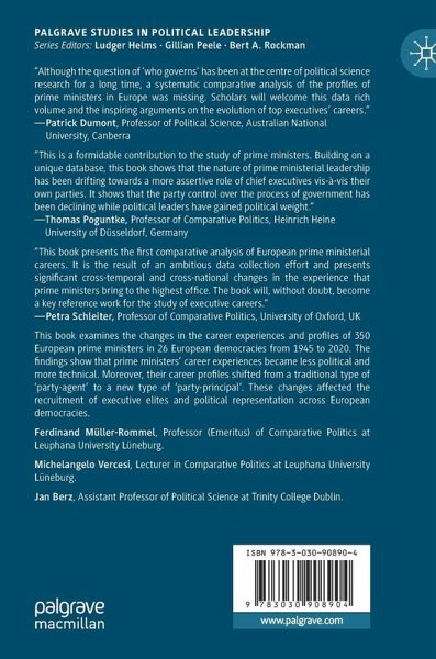 This book examines the changes in the career experiences and profiles of 350 European prime ministers in 26 European democracies from 1945 to 2020. It builds on a theoretical framework, which claims that the decline of party government along with the increase of populism, technocracy, and the presidentialization of politics have influenced the careers of prime ministers over the past 70 years. The findings show that prime ministers' career experiences became less political and more technical. Moreover, their career profiles shifted from a traditional type of 'party-agent' to a new type of 'party-principal'. These changes affected the recruitment of executive elites and their political representation in European democracies, albeit with different intensity and speed.