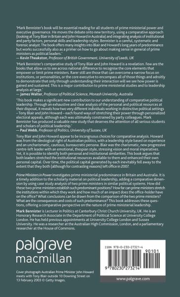 'Mark Bennister's book will be essential reading for all students of prime ministerial power and executive governance. He moves the debate onto new territory, using a comparative approach (looking at Tony Blair in Britain and John Howard in Australia) and integrating analysis of institutional and party factors, personal skills and leadership styles. Bennister is a careful, systematic and forensic analyst. The book offers many insights into Blair and Howard's long years of predominance but works successfully also as a primer on how to go about making sense in general of Prime Ministers as political leaders.' - Kevin Theakston, Professor of British Government, University of Leeds, UK