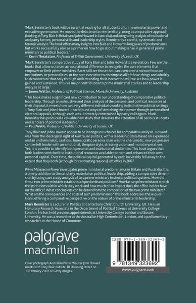 'Mark Bennister's book will be essential reading for all students of prime ministerial power and executive governance. He moves the debate onto new territory, using a comparative approach (looking at Tony Blair in Britain and John Howard in Australia) and integrating analysis of institutional and party factors, personal skills and leadership styles. Bennister is a careful, systematic and forensic analyst. The book offers many insights into Blair and Howard's long years of predominance but works successfully also as a primer on how to go about making sense in general of Prime Ministers as political leaders.' - Kevin Theakston, Professor of British Government, University of Leeds, UK 'This book makes a significant new contribution to our understanding of comparative political leadership. Through an exhaustive and clear analysis of the personal and political resources at their disposal, it reveals how two very different individuals working in distinctive political settings - former British prime minister Tony Blair and the ex-premier of Australia, John Howard - each found ways of stretching their power through personalized electoral appeals, although each was ultimately constrained by party colleagues. Mark Bennister has produced a valuable new study that deserves the attention of all serious students and scholars of political leadership.' - Paul Webb, Professor of Politics, University of Sussex, UK 'Mark Bennister's comparative study of Tony Blair and John Howard is a revelation. Few are the books that allow us to see across national difference to recognise the core elements that empower or limit prime ministers. Rarer still are those that can overcome a narrow focus on institutions, or personalities, or the core executive to encompass all of those things and adroitly to demonstrate that only through understanding their interaction will we see how power is gained and sustained. This is a major contribution to prime ministerial studies and to leadership analysis at large.' - James Walter, Professor of Political Science, Monash University, Melbourne, Australia 'a wealth of comparative detail for students of government organisation' - Jill Rutter, LSE Book Reviews Recommended by Choice
