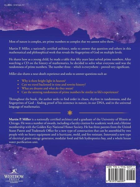 Most of nature is complex, are prime numbers so complex that we cannot solve them. Martin P. Miller, a nationally certified architect, seeks to answer that question and others in this mathematical and philosophical work that reveals the fingerprints of God on multiple levels. He shares how as a young child, he made a table that fifty years later solved prime numbers. After watching a CD on the history of mathematics, he decided to solve what everyone said was the randomness of prime numbers. The number three - which is everywhere - proved very significant. Miller also shares a near-death experience and seeks to answer questions such as: ¿ Why is there bright light in heaven? ¿ Can we travel backward in time and rewrite history? ¿ What are dreams and what do they mean? ¿ Can the seeming randomness of prime numbers be similar to life's experiences? Throughout the book, the author seeks to find order in chaos, rhythm in randomness, and the fingerprints of God - finding proof of his existence in nature, in our DNA, and in the universal language of mathematics.