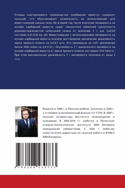 Othody acetilenowogo proizwodstwa (karbidnaq izwest') soderzhat kal'cij, chto obuslawliwaet wozmozhnost' ih ispol'zowaniq dlq izwestkowaniq kislyh pochw. Na wtoroj god posle wneseniq melioranta na osnowe karbidnoj izwesti sdwig pokazatelq obmennoj kislotnosti dernowo-podzolistoj supeschanoj pochwy ot wneseniq 1 t d.w. SaSO3 sostawil 0,27-0,35 ed. rN. Izwestkowanie s ispol'zowaniem melioranta na osnowe karbidnoj izwesti okazalo dostowernoe uwelichenie urozhajnost' zerna qrowogo qchmenq na 2.6-6,1 c/ga. Jeto proizoshlo za schöt uwelicheniq massy 1000 semqn na 2,9-11,4 g. Okupaemost' 1 t wynesennogo meliorata na osnowe karbidnoj izwesti kg zerna qrowogo qchmenq sostawila 70.0-130.0 kg. Pri ätom maximal'naq urozhajnost' 1 t melioranta poluchena ot dozy 2 t/ga.