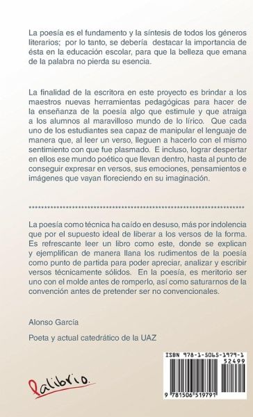 La poesa es el fundamento y la sntesis de todos los gneros literarios; por lo tanto, se debera destacar la importancia de sta en la educacin escolar, para que la belleza que emana de la palabra no pierda su esencia. La finalidad de la escritora en este proyecto es brindar a los maestros nuevas herramientas pedaggicas para hacer de la enseanza de la poesa algo que estimule y que atraiga a los alumnos al maravilloso mundo de lo lrico. Que cada uno de los estudiantes sea capaz de manipular el lenguaje de manera que, al leer un verso, lleguen a hacerlo con el mismo sentimiento con que fue plasmado. E incluso, lograr despertar en ellos ese mundo potico que llevan dentro, hasta al punto de conseguir expresar en versos, sus emociones, pensamientos e imgenes que vayan floreciendo en su imaginacin. La finalidad de la escritora en este proyecto es brindar a los maestros nuevas herramientas pedaggicas para hacer de la enseanza de la poesa algo que estimule y que atraiga a los alumnos al maravilloso mundo de lo lrico. Que cada uno de los estudiantes sea capaz de manipular el lenguaje de manera que, al leer un verso, lleguen a hacerlo con el mismo sentimiento con que fue plasmado. E incluso, lograr despertar en ellos ese mundo potico que llevan dentro, hasta al punto de conseguir expresar en versos, sus emociones, pensamientos e imgenes que vayan floreciendo en su imaginacin. La poesa como tcnica ha cado en desuso, ms por indolencia que por el supuesto ideal de liberar a los versos de la forma. Es refrescante leer un libro como este, donde se explican y ejemplifican de manera llana los rudimentos de la poesa como punto de partida para poder apreciar, analizar y escribir versos tcnicamente slidos. En la poesa, es meritorio ser uno con el molde antes de romperlo, as como saturarnos de la convencin antes de pretender ser no convencionales. Alonso Garca Poeta y actual catedrtico de la UAZ